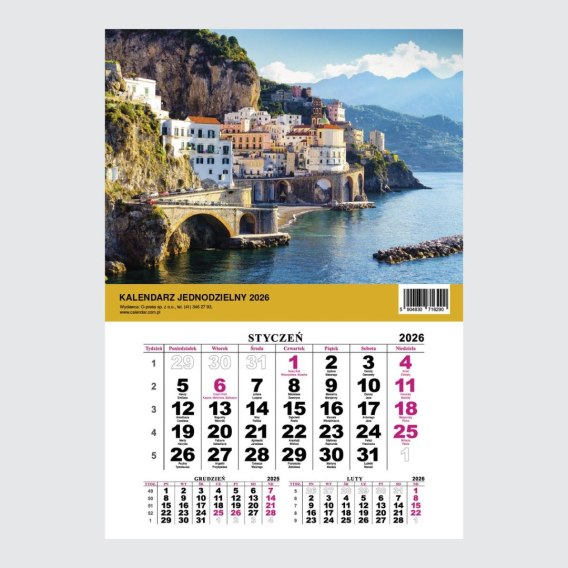 - Format 210x295x2 mm - Ilość stron: 12 - Oprawa: szyta - Układ kalendarium: jeden miesiąc-1 kartka - Kalendarz posiada dziurkę umożliwiającą powieszenie - Zawiera czytelne kalendarium z imieninami i świetami w języku polskim - Posiada okienko przesuwne Kalendarz Jednodzielny to idealne rozwiązanie dla osób, które cenią sobie klarowność i przejrzystość w organizacji czasu. Zaprojektowany z myślą o maksymalnej czytelności, umożliwia szybki przegląd wszystkich zaplanowanych zadań, wydarzeń i spotkań w danym miesiącu. Każda strona kalendarza poświęcona jest jednemu miesiącowi, oferując szeroką przestrzeń do notowania ważnych terminów. Praktyczne przesuwane okienko pozwala intuicyjnie zaznaczać bieżące dni, co znacząco ułatwia codzienne użytkowanie i czyni kalendarz wyjątkowo funkcjonalnym. Wyposażony w wytrzymałą dziurkę do zawieszenia, kalendarz można z łatwością umieścić na ścianie, dzięki czemu zawsze pozostaje w zasięgu wzroku i gotowy do użycia. Doskonale sprawdzi się zarówno w domowym gabinecie, jak i w biurze, oferując szybki dostęp do informacji o dacie i wspierając efektywne planowanie. Dostępne wzory: Krajobraz, Góry, Milusińscy, Pies