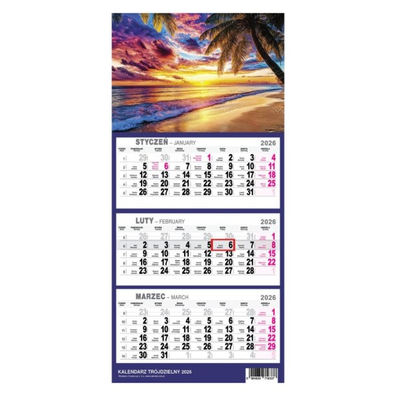 - Format 210x450x4 mm - Ilość stron: 12 - Oprawa: szyta - Układ kalendarium: jeden miesiąc-1 kartka - Kalendarz posiada dziurkę umożliwiającą powieszenie - Zawiera czytelne kalendarium z imieninami i świetami w języku polskim - Posiada okienko przesuwne Kalendarz Trójdzielny w mniejszym formacie (210 x 450 x 4 mm) to kompaktowe i praktyczne rozwiązanie dla osób, które chcą mieć szybki dostęp do dat przy ograniczonej przestrzeni. Idealny zarówno do użytku domowego, jak i biurowego szczególnie tam, gdzie miejsce na ścianie jest ograniczone, a potrzeba organizacji czasu niezmienna. Zaprojektowany z myślą o funkcjonalności i estetyce, kalendarz oferuje jednoczesny wgląd w trzy miesiące bieżący oraz dwa poprzednie co znacząco ułatwia planowanie i śledzenie wcześniejszych wydarzeń. Praktyczne przesuwane okienko pozwala na intuicyjne zaznaczanie aktualnego dnia, co sprawia, że codzienne korzystanie z kalendarza jest wygodne i szybkie. Dzięki kompaktowym wymiarom doskonale sprawdzi się nawet w niewielkich przestrzeniach roboczych. Wyposażony w wytrzymałą dziurkę, kalendarz można łatwo i bezpiecznie zawiesić na ścianie, zapewniając jego widoczność oraz dostępność w każdej chwili. Mimo mniejszego rozmiaru, kalendarz zachowuje czytelność kalendarium i komfort użytkowania. Dodatkowym atutem jest staranne opakowanie w folię ochronną, które chroni produkt przed uszkodzeniami podczas transportu, gwarantując jego nienaganny wygląd po dostarczeniu. Dostępne wzory: Pies, Góry, Kot, Plaża