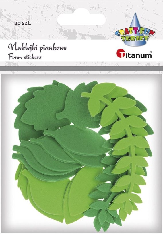 Naklejki piankowe, wzory: liście paproci 27x85 mm, grabu 31x46 mm, gładkie 22x45 mm, zielone, jasnozielone. 20 sztuk.