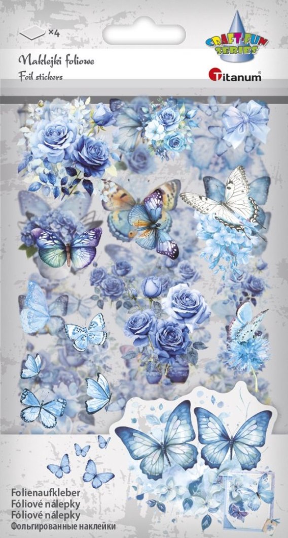 Naklejki foliowe, 4 plansze, wzory: motyle, kwiaty. tonacja niebieska.