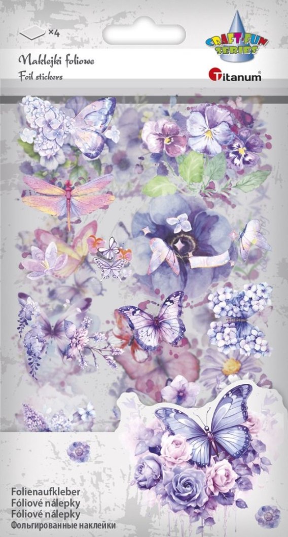 Naklejki foliowe, 4 plansze, wzory: motyle, kwiaty. tonacja fioletowa.
