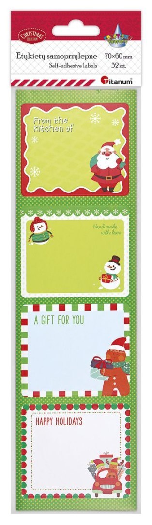 Etykiety samoprzylepne, wzory: Boże Narodzenie, wymiar etykiety: 70x60 mm, 8 plansz, 32 sztuki.