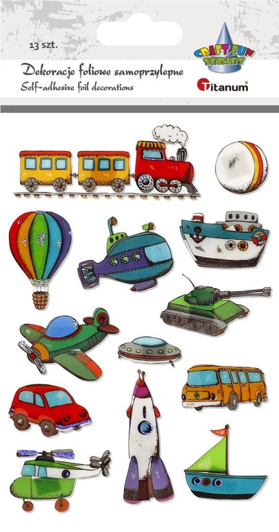 Naklejki foliowe 3D. Wzór: pojazdy, kolory: mix. 13 sztuk.
