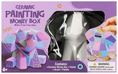 Zalety produktu: rozwija kreatywność dziecka, rozwija zdolności manualne dziecka. Każda mała dusza artystyczna będzie zachwycona możliwością zabawy z Zestawem Kreatywnym od MEGA CREATIVE. Zestaw to idealne rozwiązanie spędzania czasu podczas zabaw z twoją pociechą! Dziecko może stworzyć swoją własną unikatową skarbonkę. Zawartość zestawu: 1 x skarbonka do malowania, 7 kolorów farb, pędzel, talerzyk. Całość wykonana z gipsu i plastiku. Wymiary/waga/baterie: wymiary produktu (dł. x wys. x gł.) [cm]: 14x12x10, wymiary opakowania (dł. x wys. x gł.)[cm]: 26x13x12, waga produktu bez opakowania [kg]: 0,34 kg, waga produktu w opakowaniu [kg]: 0,60 kg, nie wymaga zasilania bateriami. Produkty bezpieczne dla dziecka. Zabawka przeznaczona dla dzieci w wieku: 3+. Pakowana w kartonik z okienkiem. W kartonie zbiorczym po 12 szt.